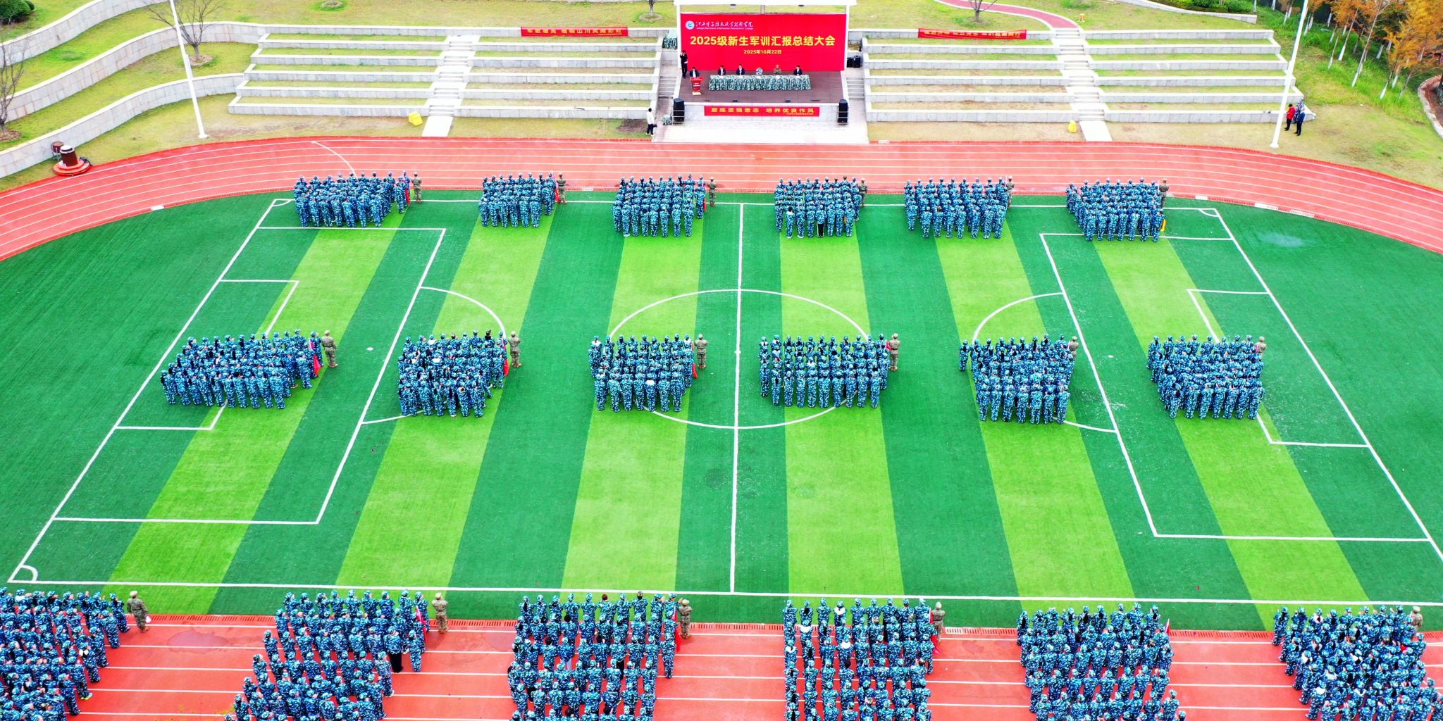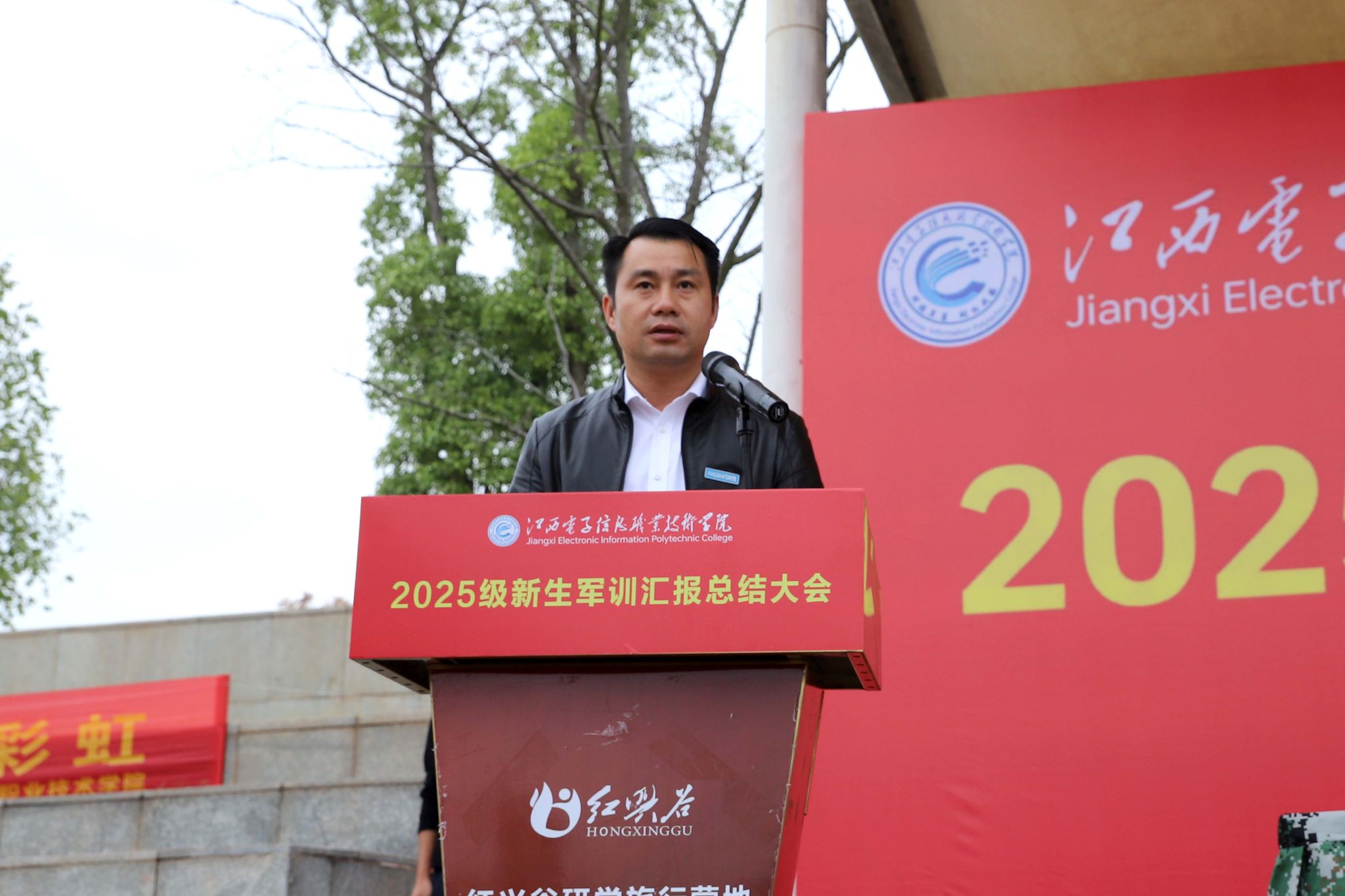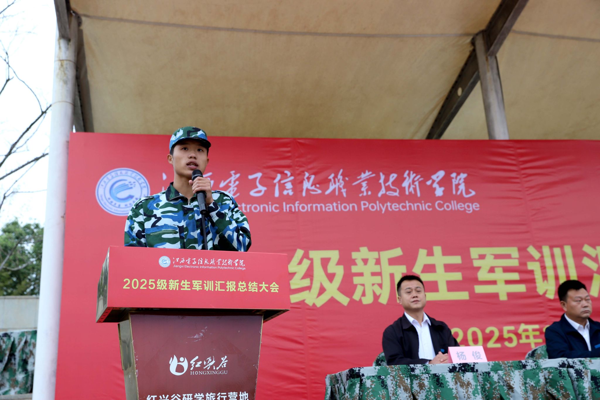 旌旗猎猎展风采,迷彩灼灼映初心。10月22日下午15时,江西电子信息职业技术学院2025级新生军训汇报总结大会在兴国县红兴谷训练基地隆重举行。学校党委委员、副院长周重军,相关部门负责人、辅导员、全体新生及军训教官齐聚现场,共同见证这场属于青春与成长的庄严检阅。大会由学校人武部负责人李凯主持。