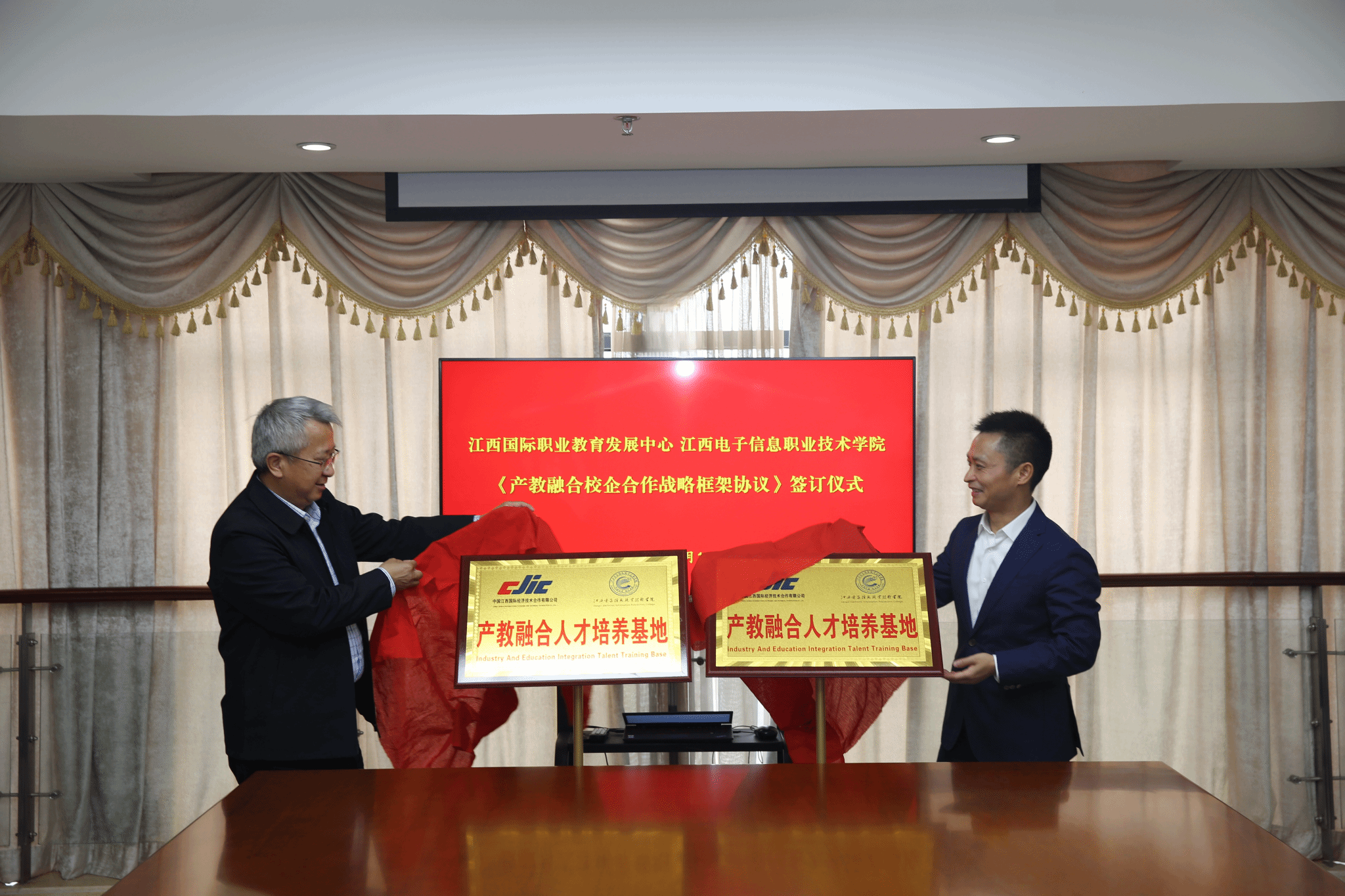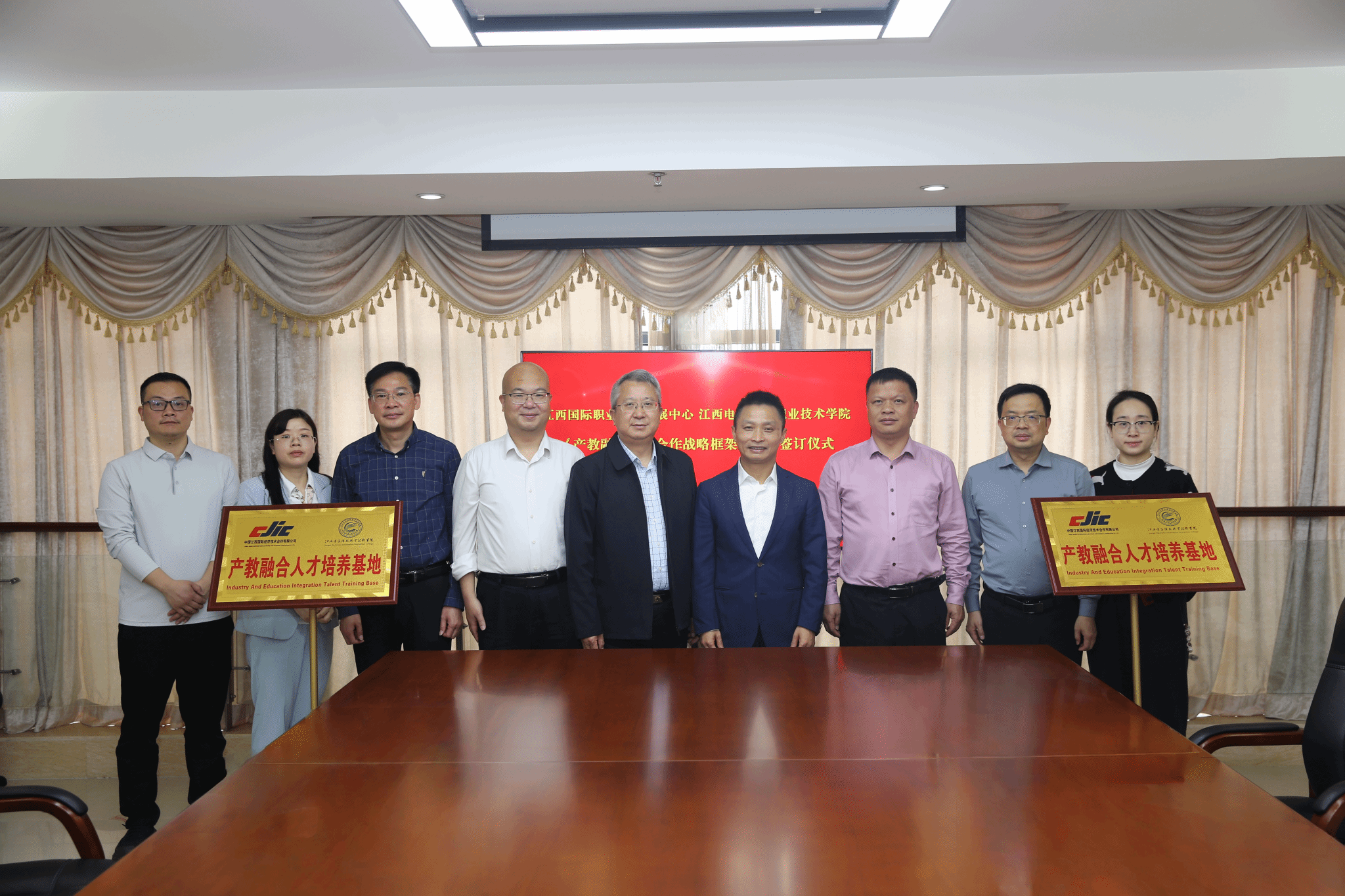 4月10日上午,江西电子信息职业技术学院与中国江西国际经济技术合作有限公司(以下简称“江西国际公司”)举行产教融合战略框架协议签订仪式。校党委书记肖红秋,副校长彭明、钟端玮,江西国际公司党委委员、副总经理李必亚,经营管理部负责人杨怀安出席签约仪式。